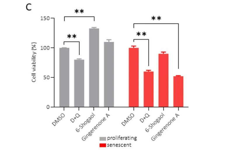更驚人的是,生姜的“6-姜酚”物質(zhì)表現(xiàn)力更猛:36小時清除率高達(dá)70%。研究負(fù)責(zé)人解釋:“這些成分能促使衰老細(xì)胞自我毀滅,騰出空間讓年輕細(xì)胞發(fā)揮最大作用,比傳統(tǒng)藥物組合達(dá)沙替尼+槲皮素(D+Q)高效的多?!?